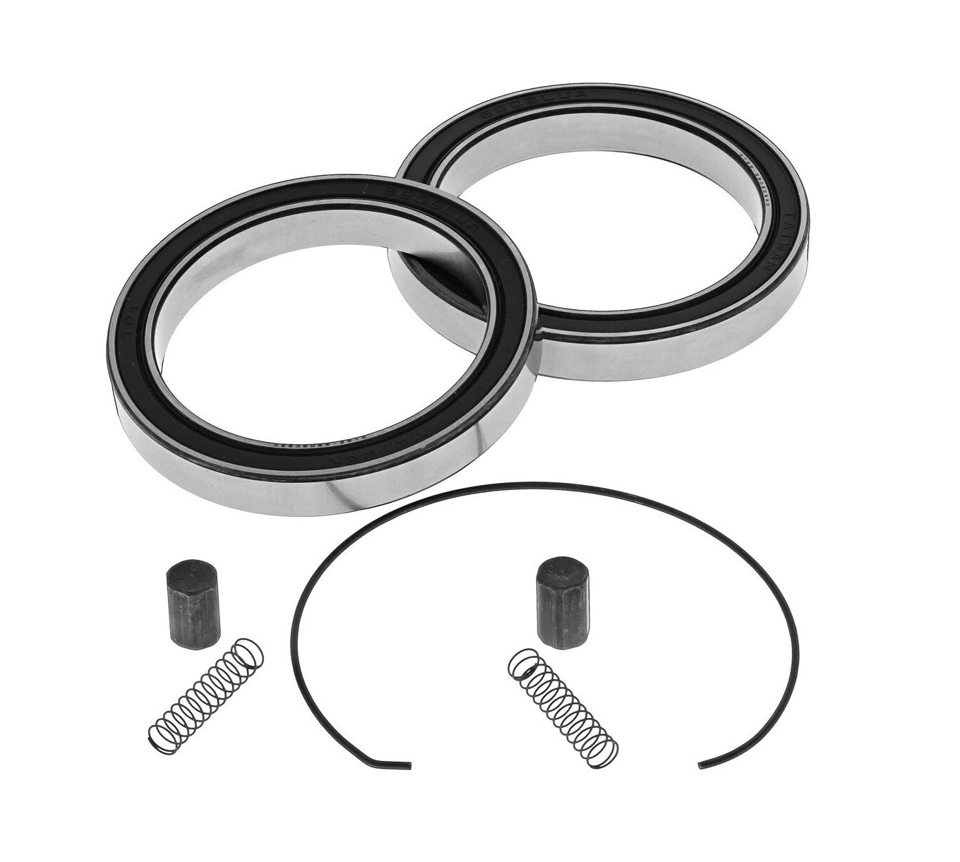 - Kit includes: two double sealed high performance bearings, one wire ring, two springs, and two pins