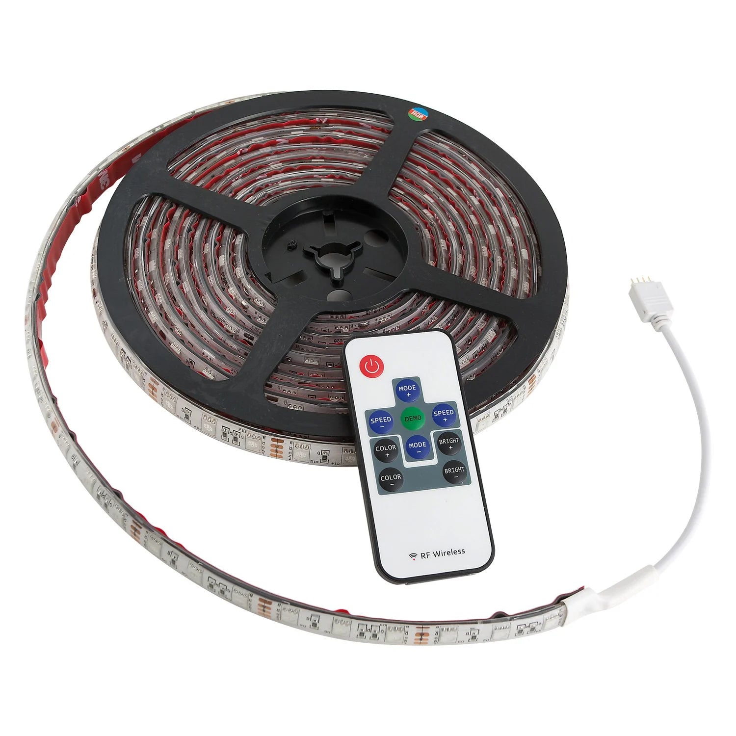 Revolution™ Series Multicolor 16' LED Light Strip by AP Products®. Red industrial strength 3M tape ensures the light will adhere to nearly any surface. PU glue is water and UV resistant. Customizable- can be cut every 2 inches to desired length. Remote can program the light to dim, fade, strobe, change color and more.